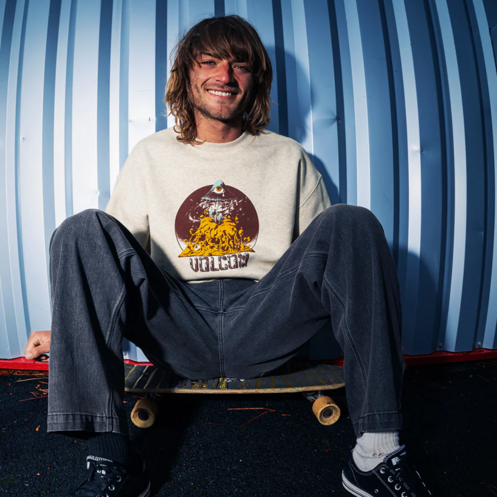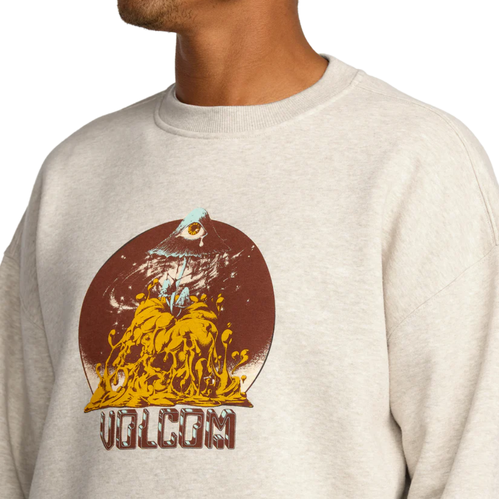 The Volcom Callum Rooney Sweatshirt - Dust Heather is a comfy sweater with an artistic twist. This loose fit sweatshirt is printed with original artwork by Callum Rooney and made with recycled materials, so you not only sit well, but do well too.