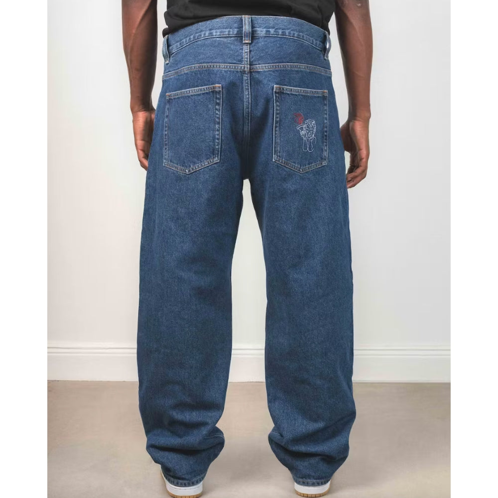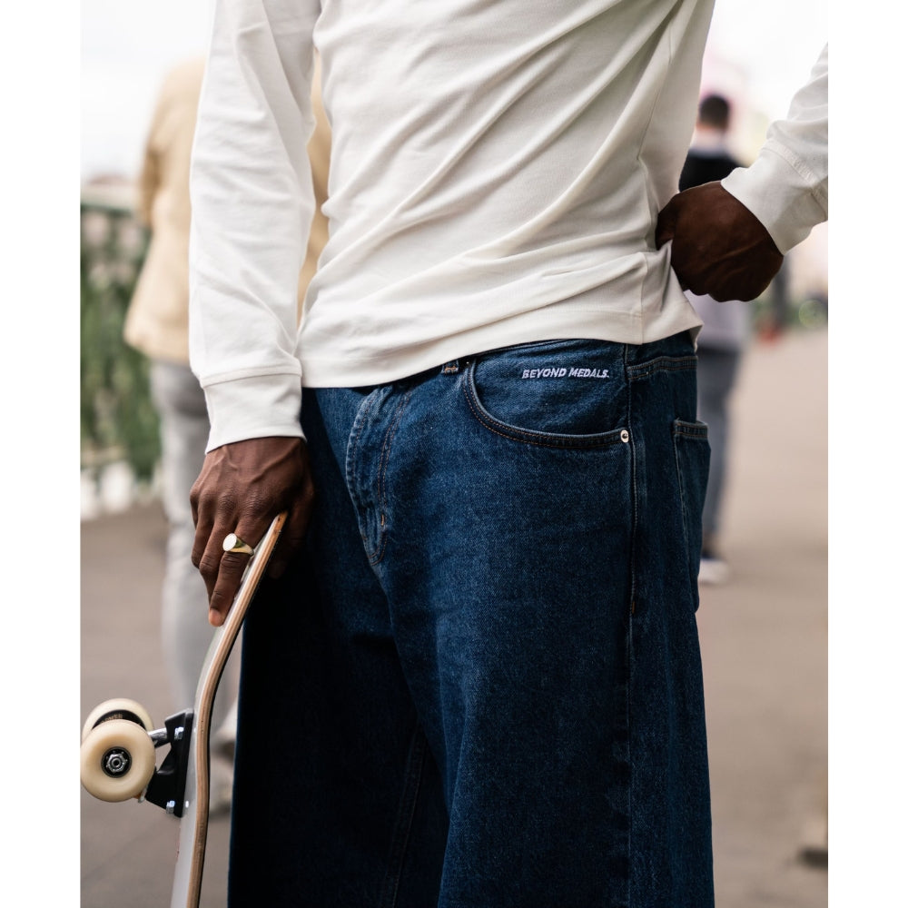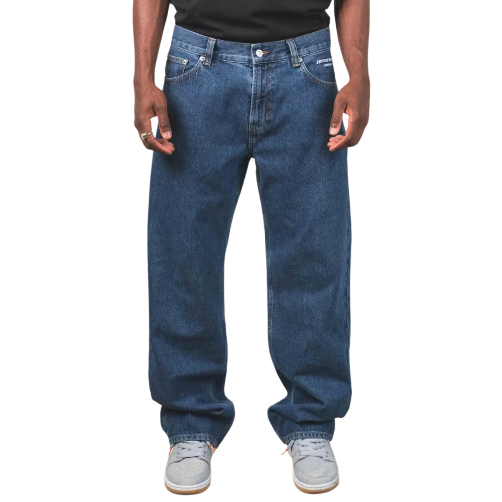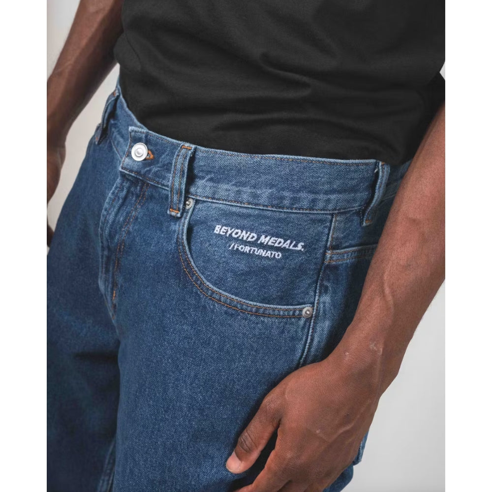 The Beyond Medals Fortunato Loose Jeans Blue is a pair of baggy jeans with embroidery on the front pocket and back pocket. It is a 5-pocket model.