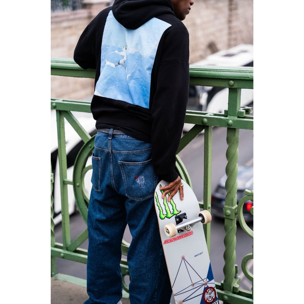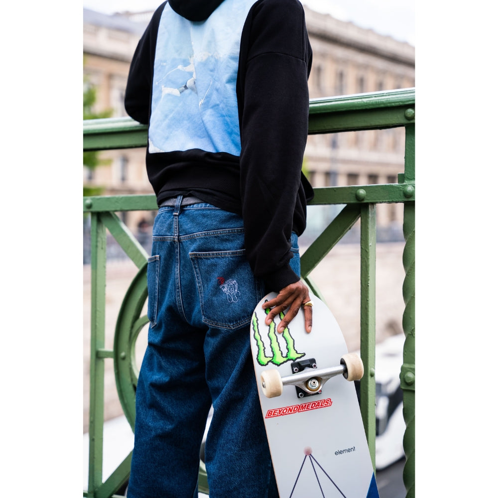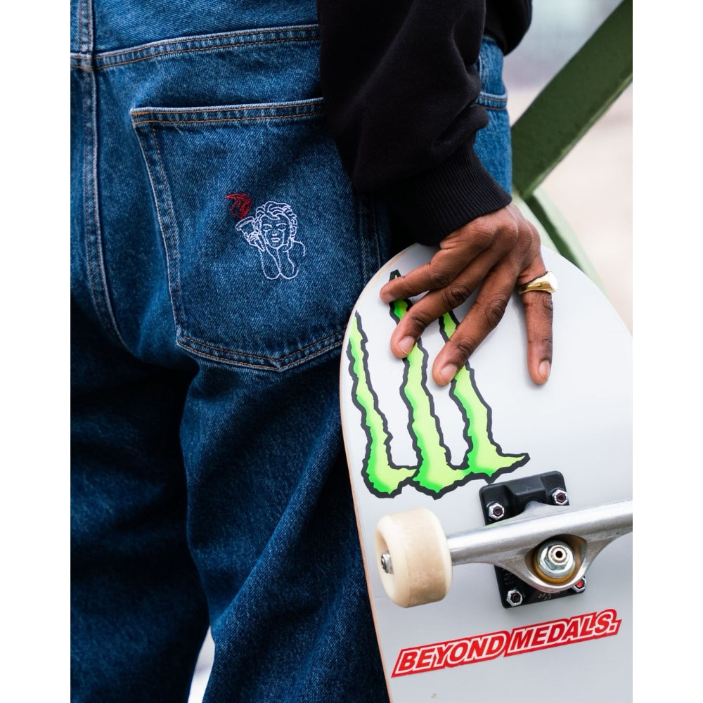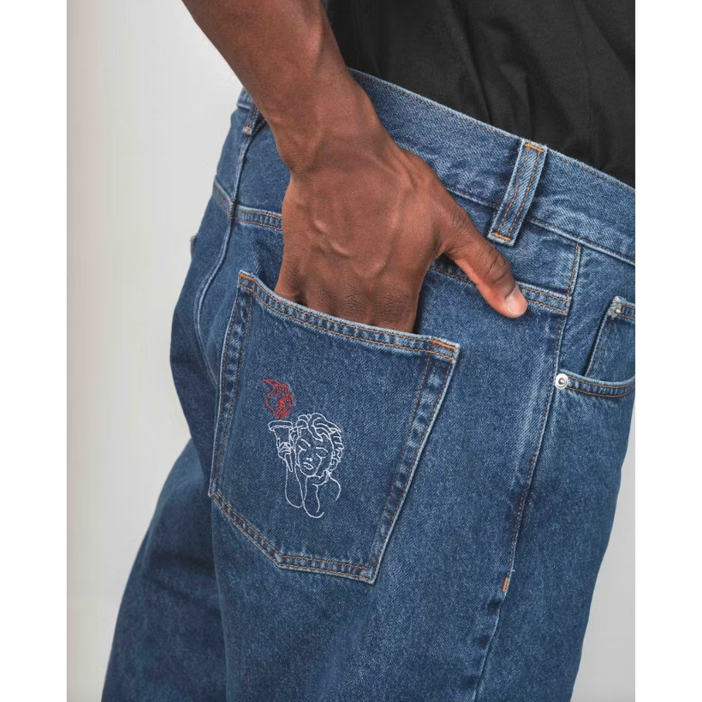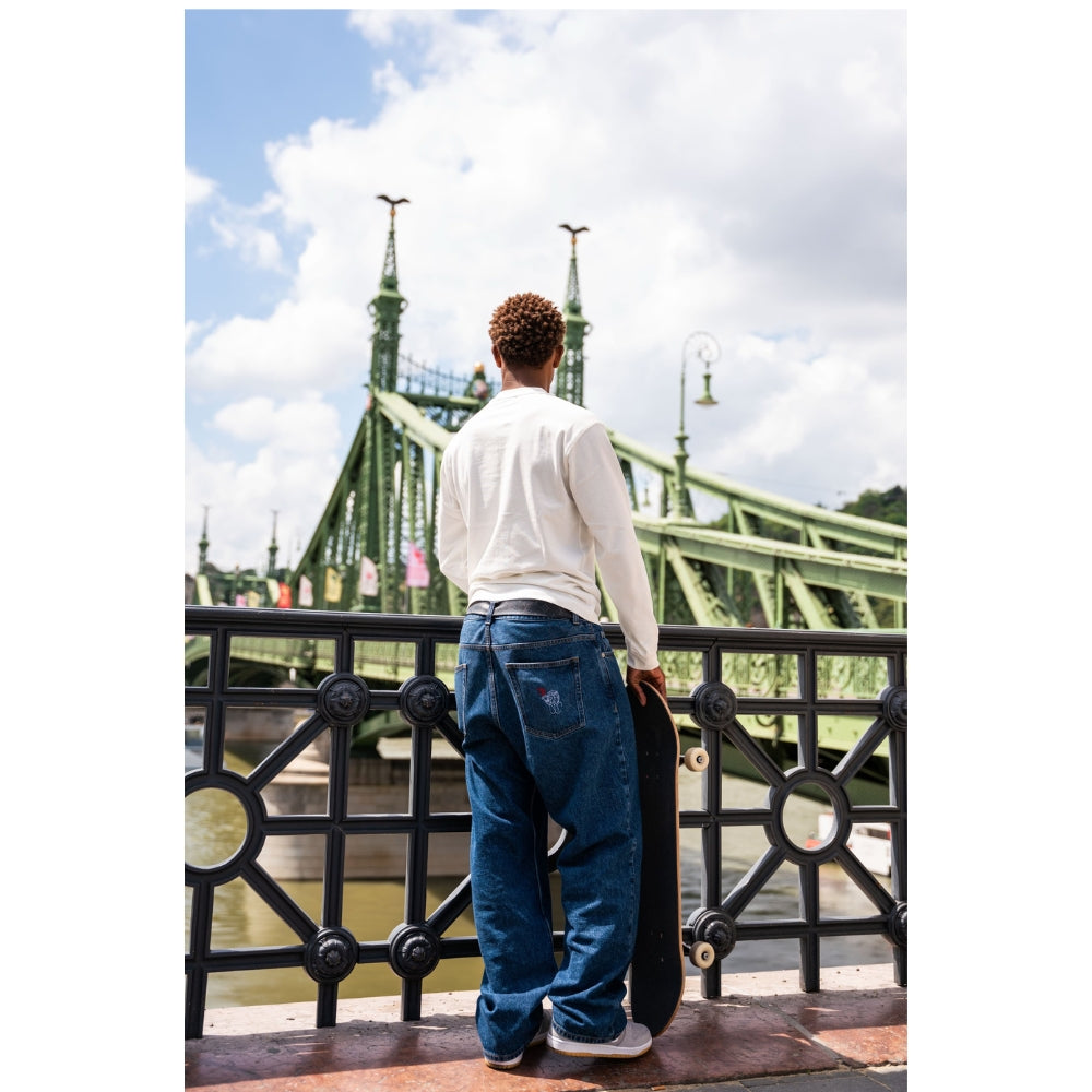 The Beyond Medals Fortunato Loose Jeans Blue is a pair of baggy jeans with embroidery on the front pocket and back pocket. It is a 5-pocket model.
