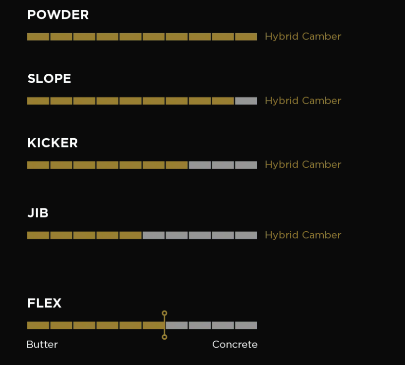 Hybrid Camber - combines camber for precision, grip and energy with mild rocker for added forgiveness and smooth turn initiation. Ideal for riders who want control without an overly aggressive board feel.
