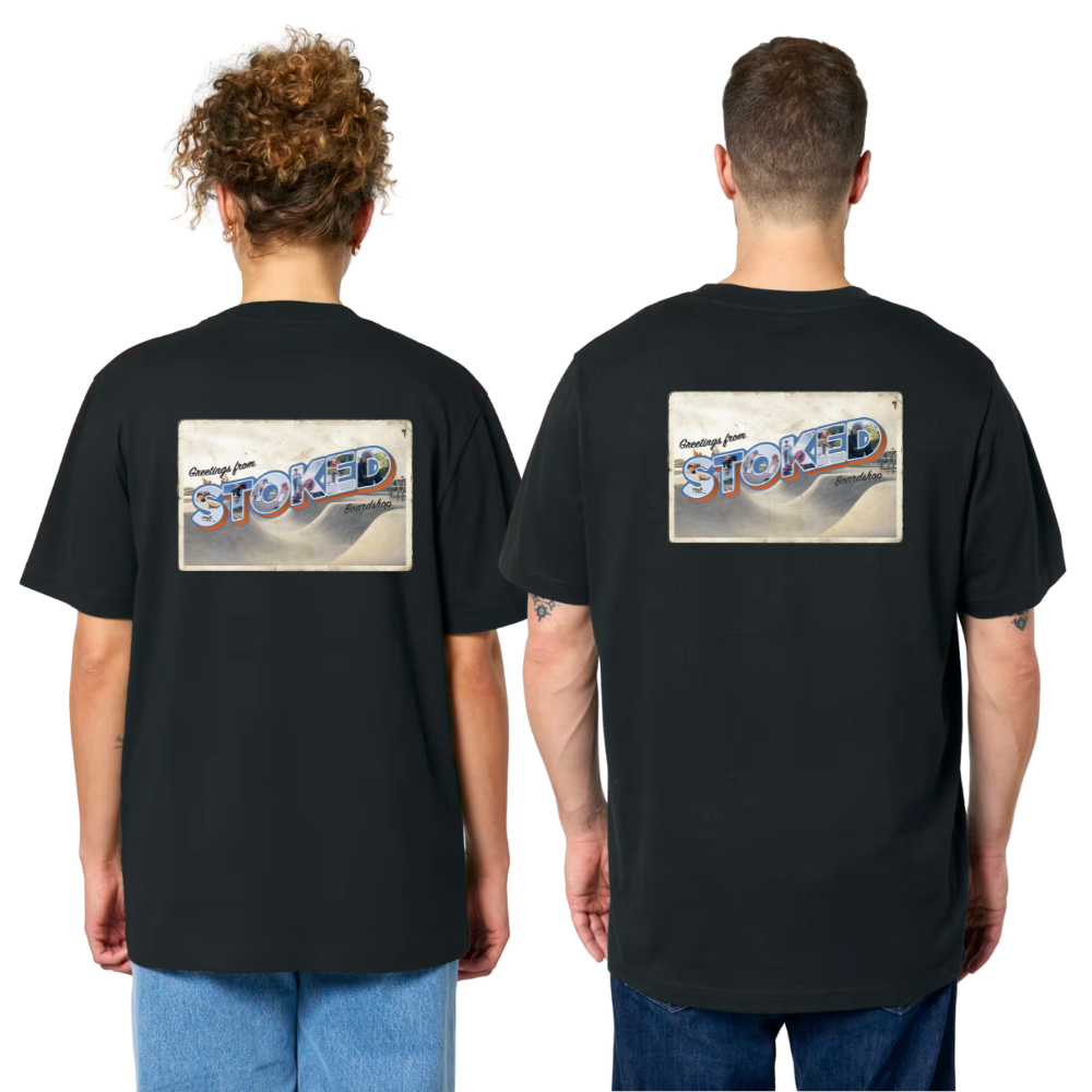 The Greetings From Stoked skate t-shirt from Stoked Board Co.'s exclusive limited edition collection pays homage to Stoked's roots. With an iconic stamp on the front representing Stoked's hometown of 1500 Halle, and a postcard design on the back featuring the Stoked skate rider team, this t-shirt brings the strength of our community and passion to your streetwear look. This design is for the people who are proud of their roots and always want to carry a piece of home with them.
