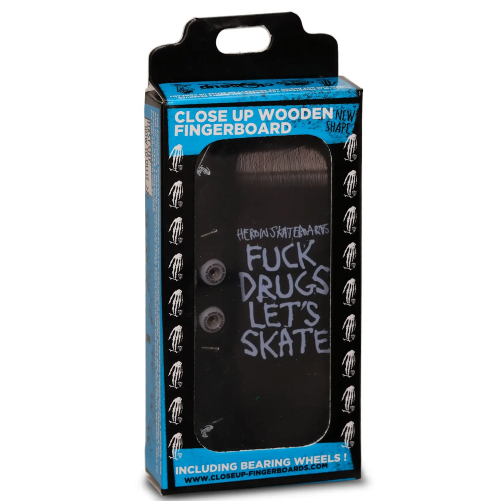 The Close Up Heroin Fuck Drugs Let's Skate Silver Trucks 33mm Fingerboard is ideal for trying out your latest tricks. This complete set you put together yourself and features a great Close Up Fingerboards graphic.