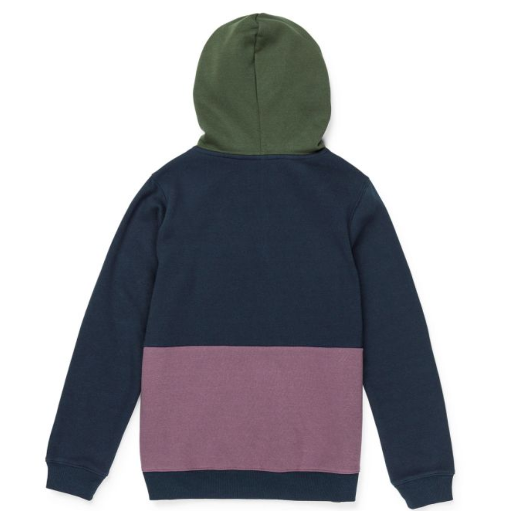 The Volcom Kids Forzee Pullover Hoodie - Navy is a stylish and comfortable choice for kids. With an eye-catching colorblock design and a classic kangaroo pocket on the front, this hoodie is perfect for every day wear. The blend of cotton and polyester provides a soft, durable fabric that is comfortable to the touch and long-lasting. Print-free, this hoodie offers a minimalist yet playful look that is easy to pair with other outfits.