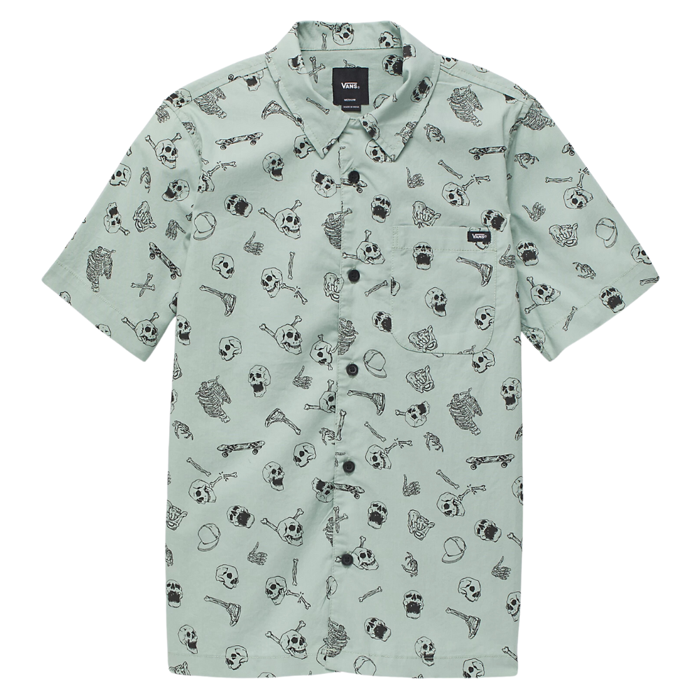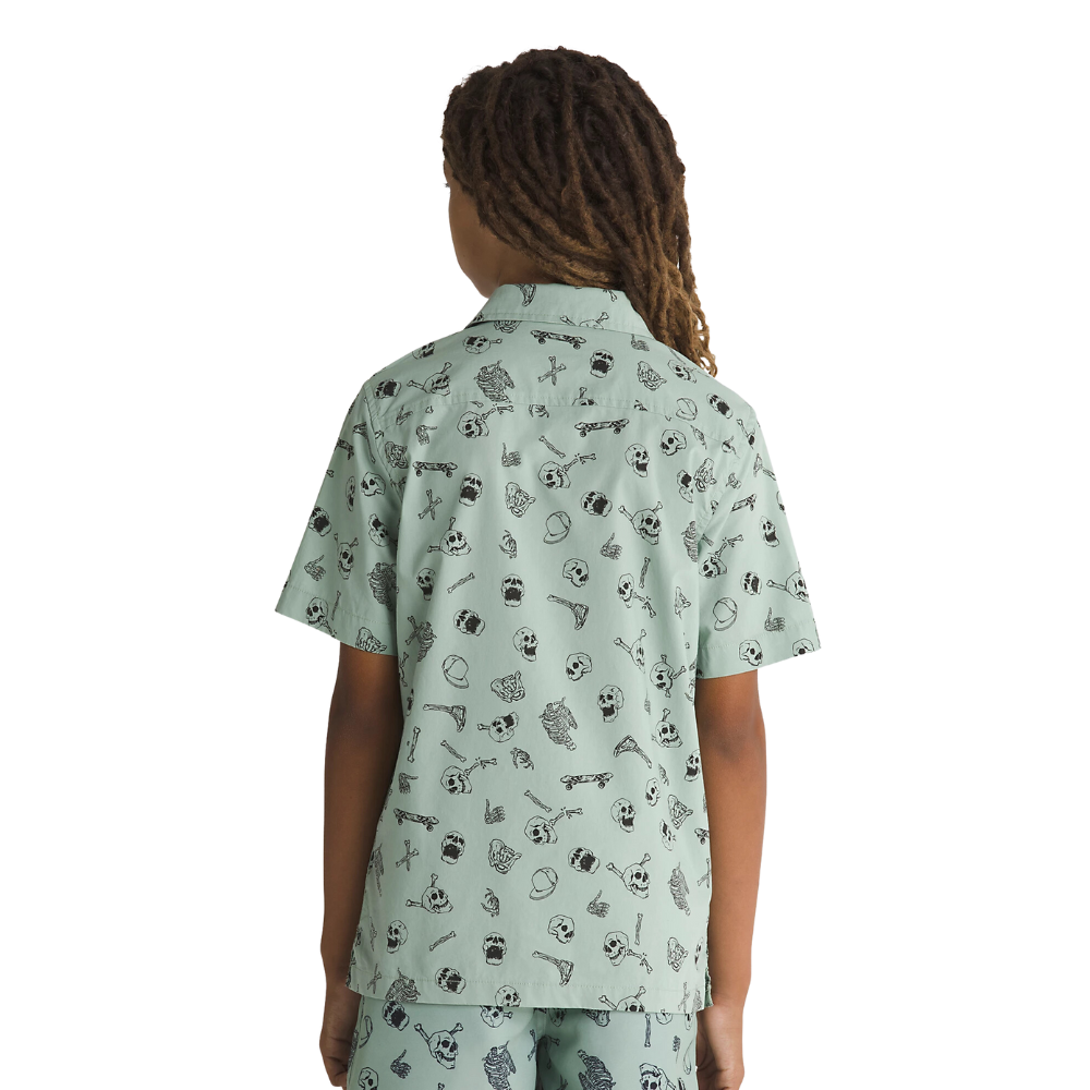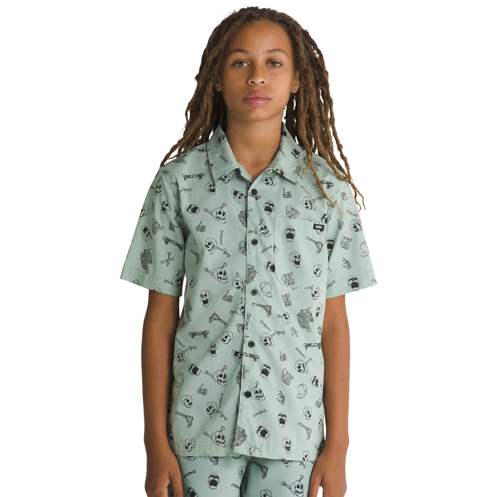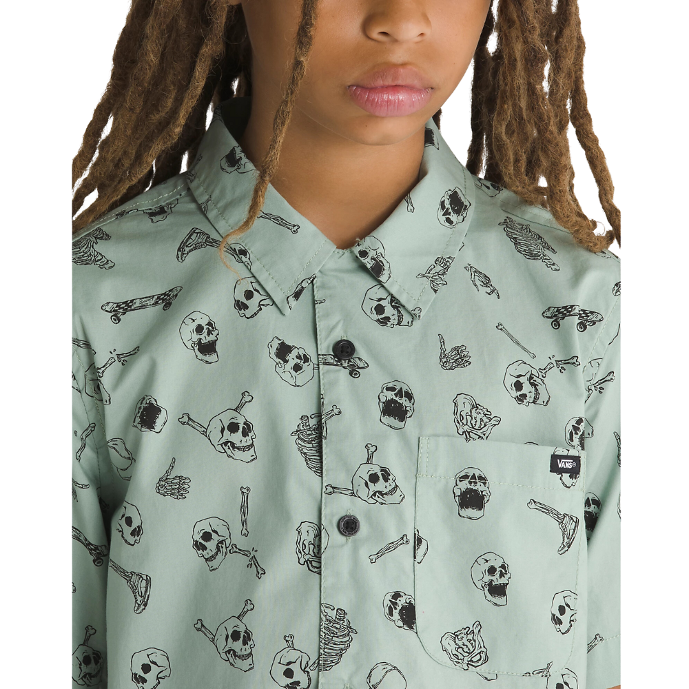 Stay stylish on those sunny days with the Kids Skeleton Shirt in beautiful Iceberg Green. This short-sleeved shirt features a full button front closure, a chest pocket and a fun skeleton print pattern.