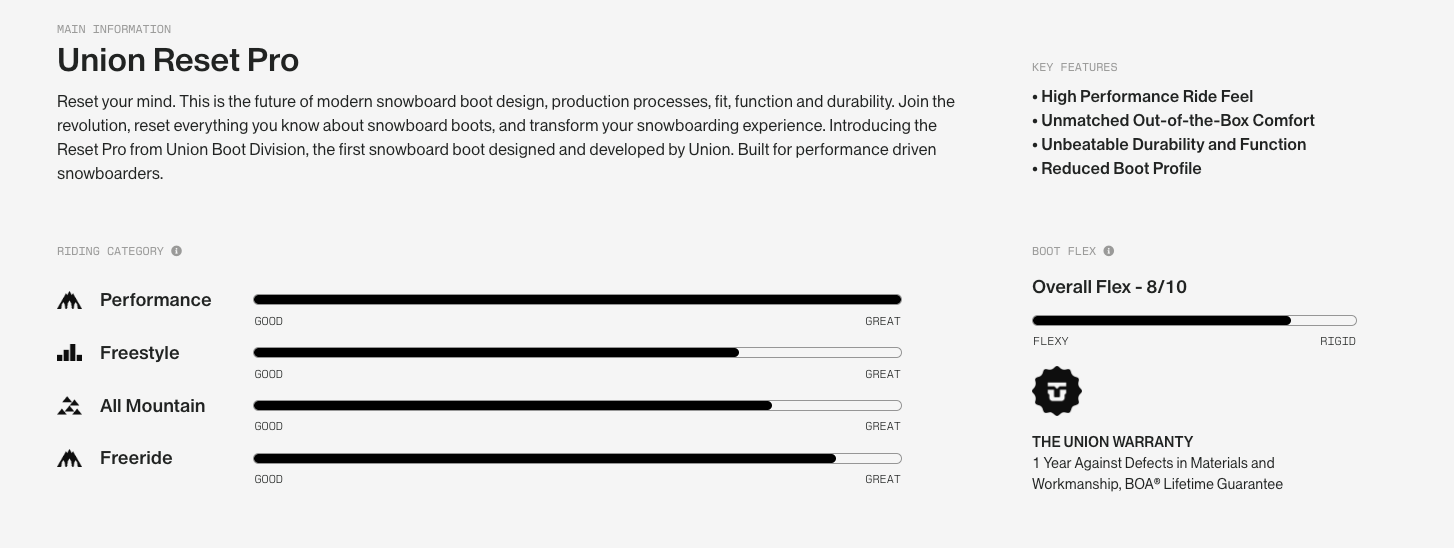 The Union Reset Pro White/Black Snowboard Boots are designed for riders who expect both comfort and performance - so we dive a little deeper into the technical specs: flex, lacing system, footbed, sole, binding compatibility and which rider this model fits.