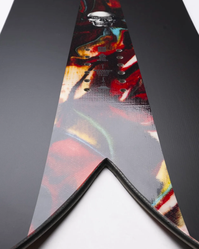 Christenson Surf Camber / Rocker - a raised nose and tail provide excellent float and easy turn initiation, while camber in the middle of the board provides strength and pop provides a responsive snowboarding experience.