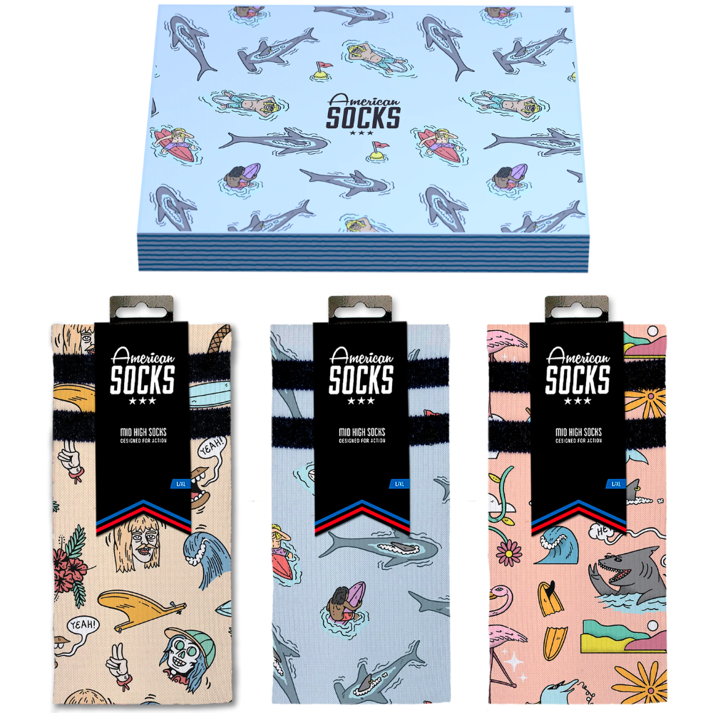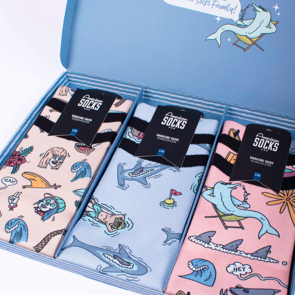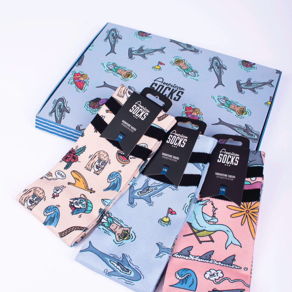 The American Socks Surfer Socks Gift Box is sure to please the surfer in the family. It comes in an original gift box and contains 3 pairs of socks. Designed for action and comfort with extra durable features.