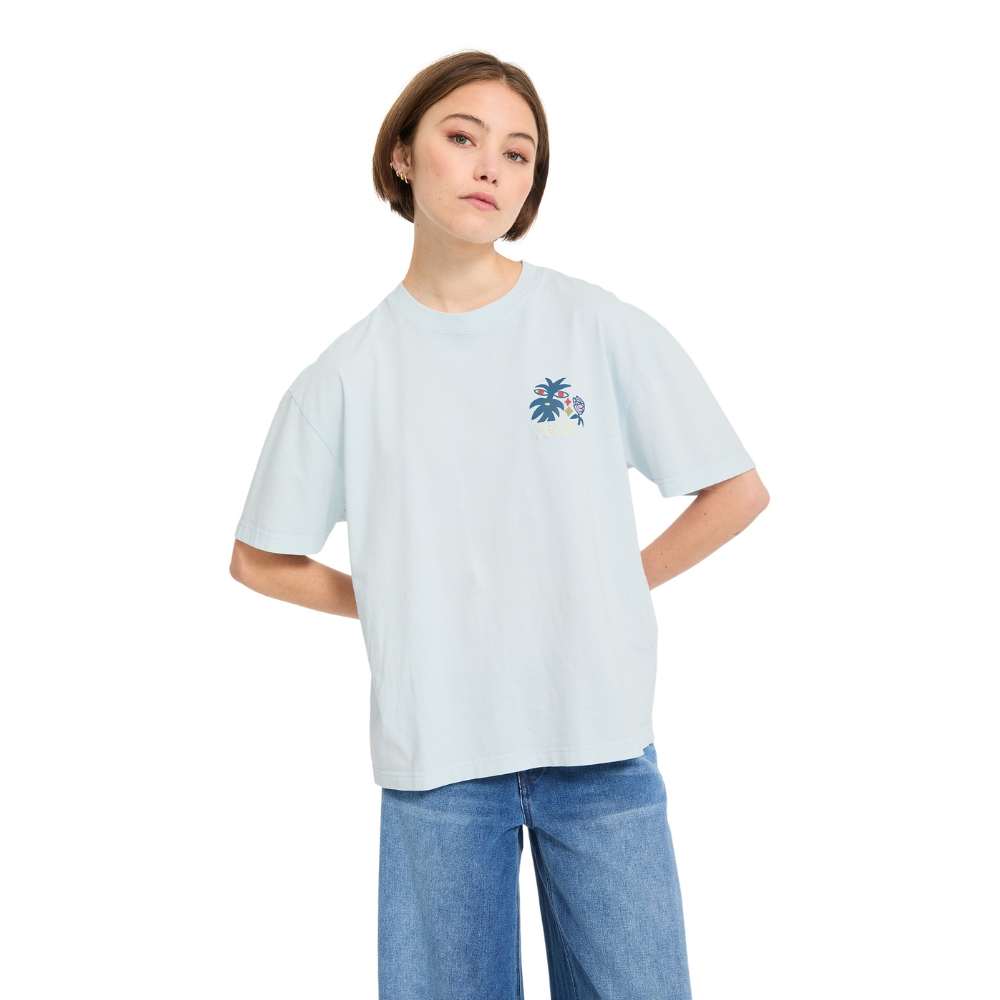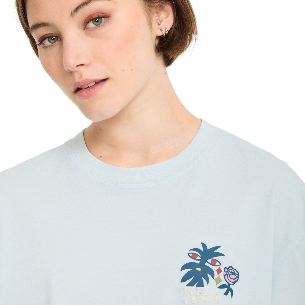 The Volcom Womens FA Bruno Lucas 2 T-Shirt Light Blue Acid is an artist-driven tee with a unique acid wash look and a powerful graphic of Bruno Lucas. The Light Blue Acid color adds character to the shirt, while the print provides a creative Volcom vibe with attitude.